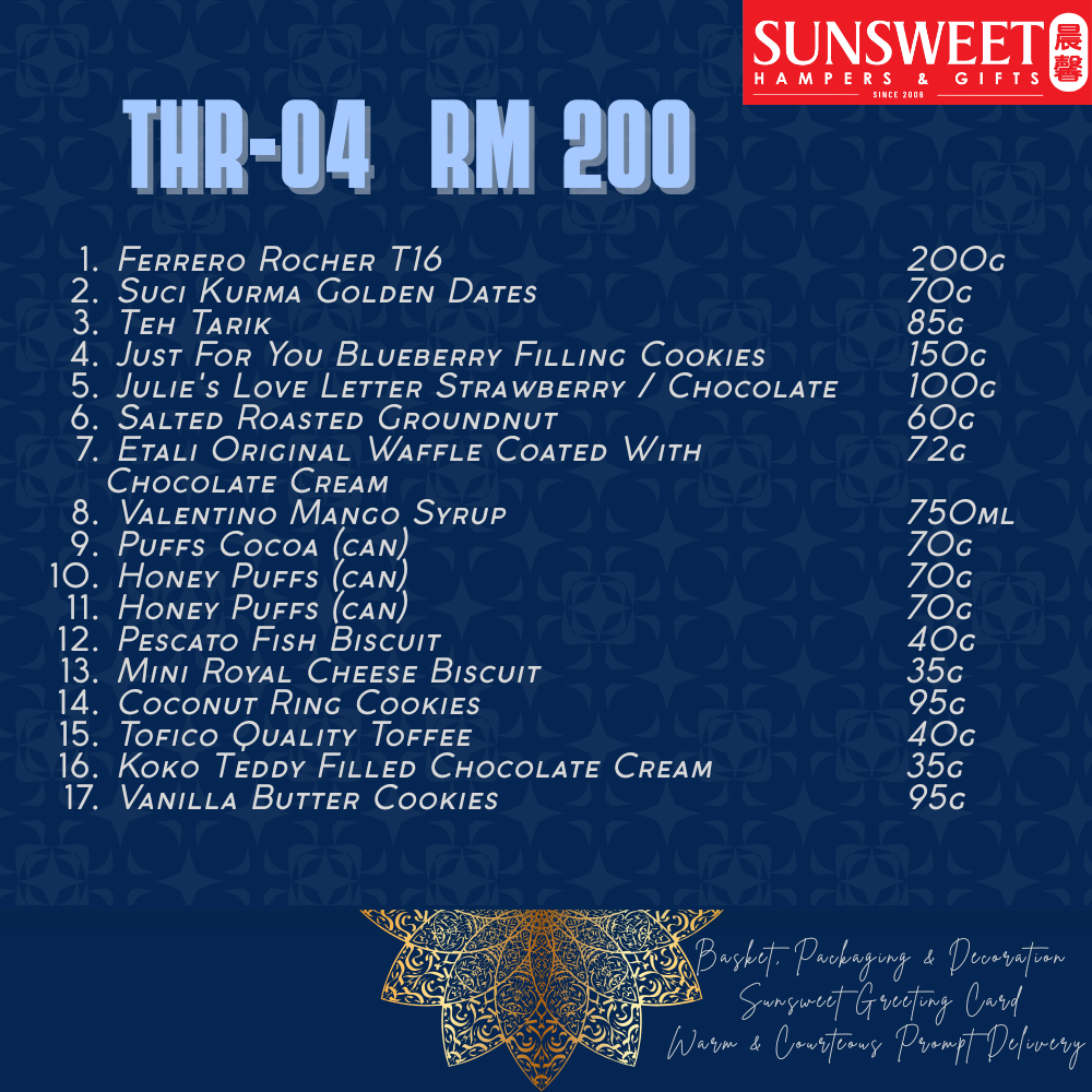 - A minimum surcharge of RM25 will apply for any hamper that needs to be RESENT or REDIRECTED.