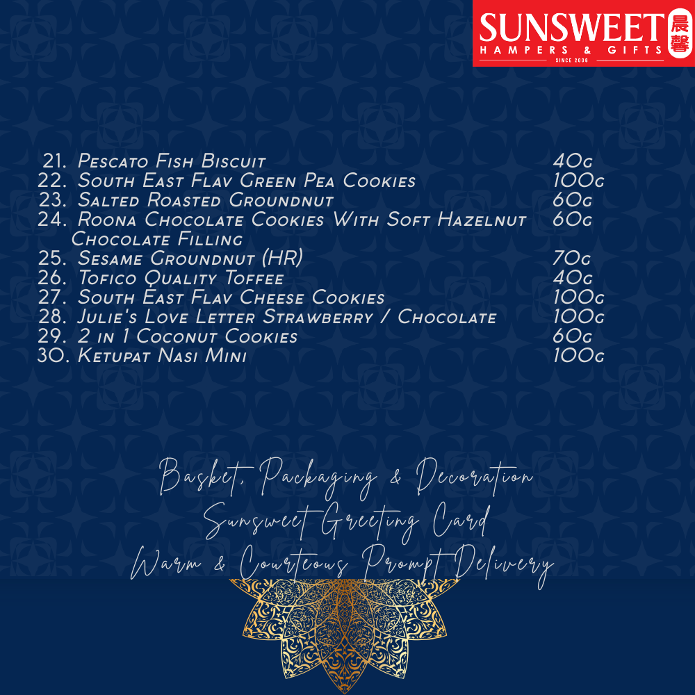 - All outstation hamper are presented in Sunsweet Hamper Box to your receivers.